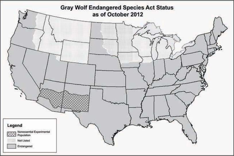 The question before us is whether the U.S. Fish and Wildlife Service (FWS) should remove the gray wolf in the U.S. from the list of endangered species. As we discussed in previous posts, wolves in Alaska, in the Northern Rocky Mountain distinct population segment, and in the Western Great Lakes distinct population segment are already off the list. Mexican gray wolves in Arizona and New Mexico and red wolves in North Carolina will continue to be protected.