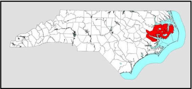 • Red shading is where red wolves live currently (North Carolina).